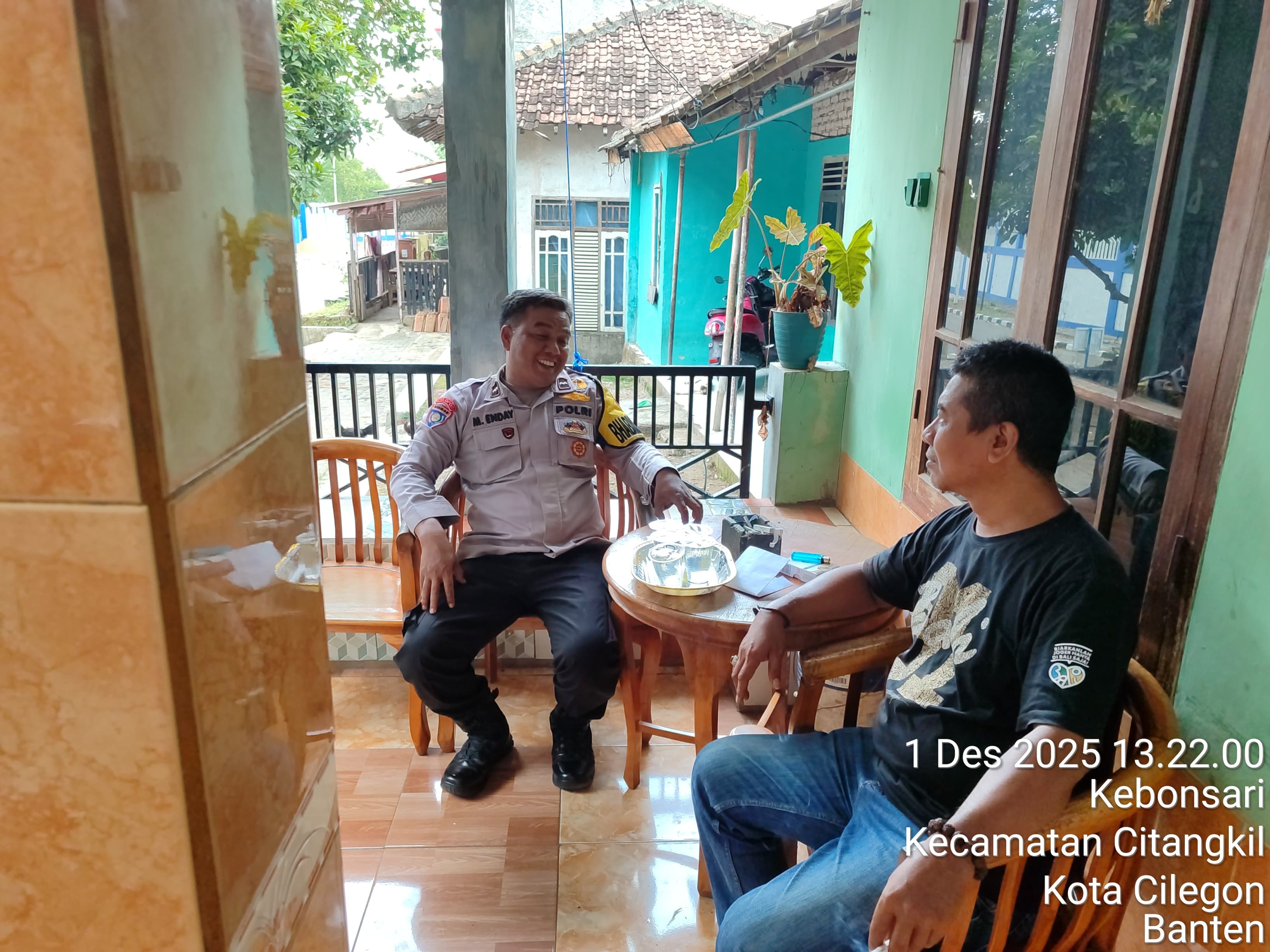 Cilegon - Bhabinkamtibmas Polsek Ciwandan Polres Cilegon Polda Banten Menyapa warga serta Ajak warga Binaannya untuk berperan aktif jaga keamanan lingkungan serta jalin komunikasi agar tercipta situasi aman di daerah hukum Polsek Ciwandan Polres Cilegon Polda Banten,Senin (01/12/2025).