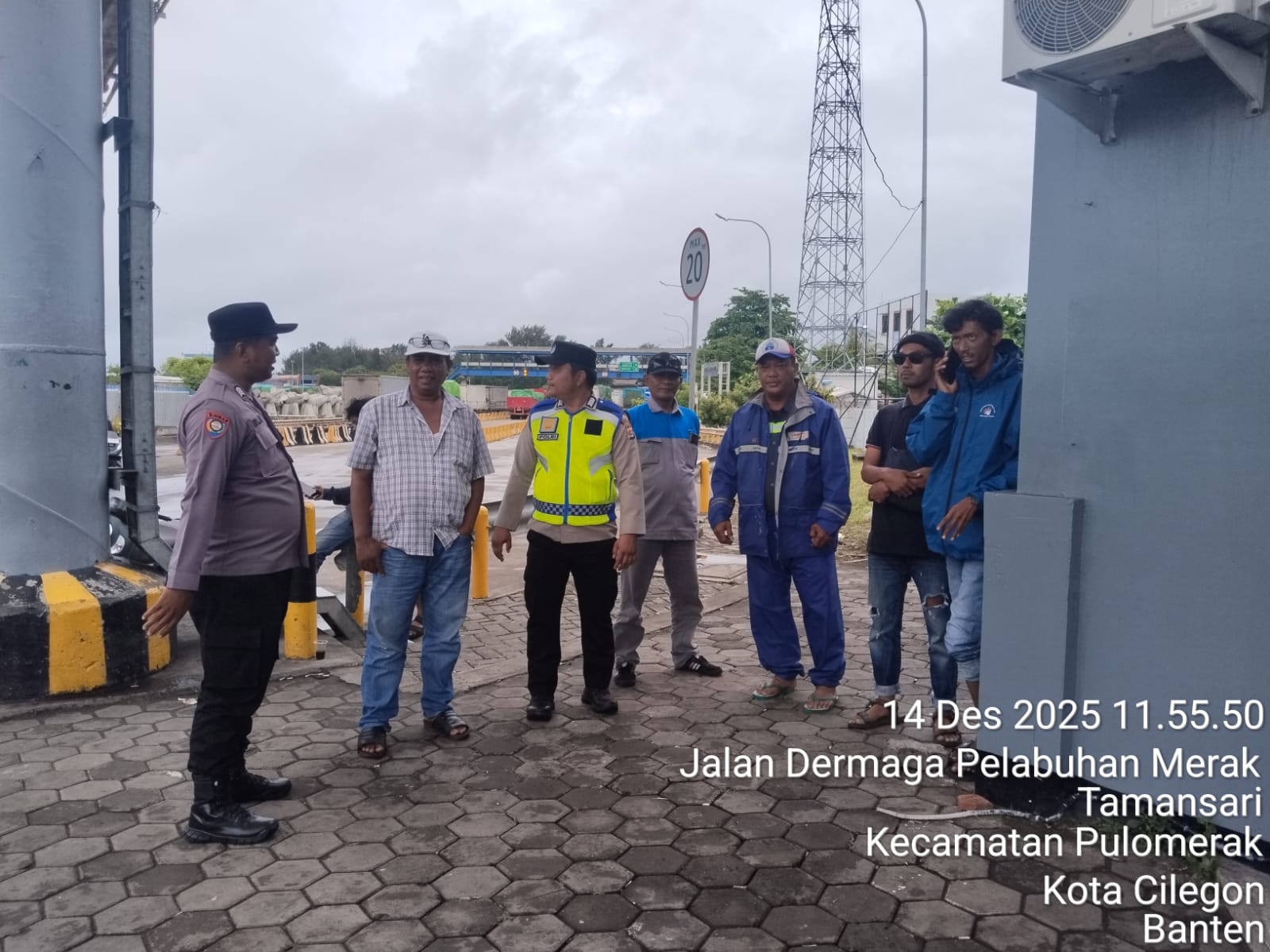 Cilegon - Personel Polsek Kskp Merak Polres Cilegon Polda Banten melaksanakan sambang dan patroli kawasan pelabuhan merak dalam rangka menjaga Harkamtibmas di Kawasan Pelabuhan Merak, Minggu (14/12/2025).