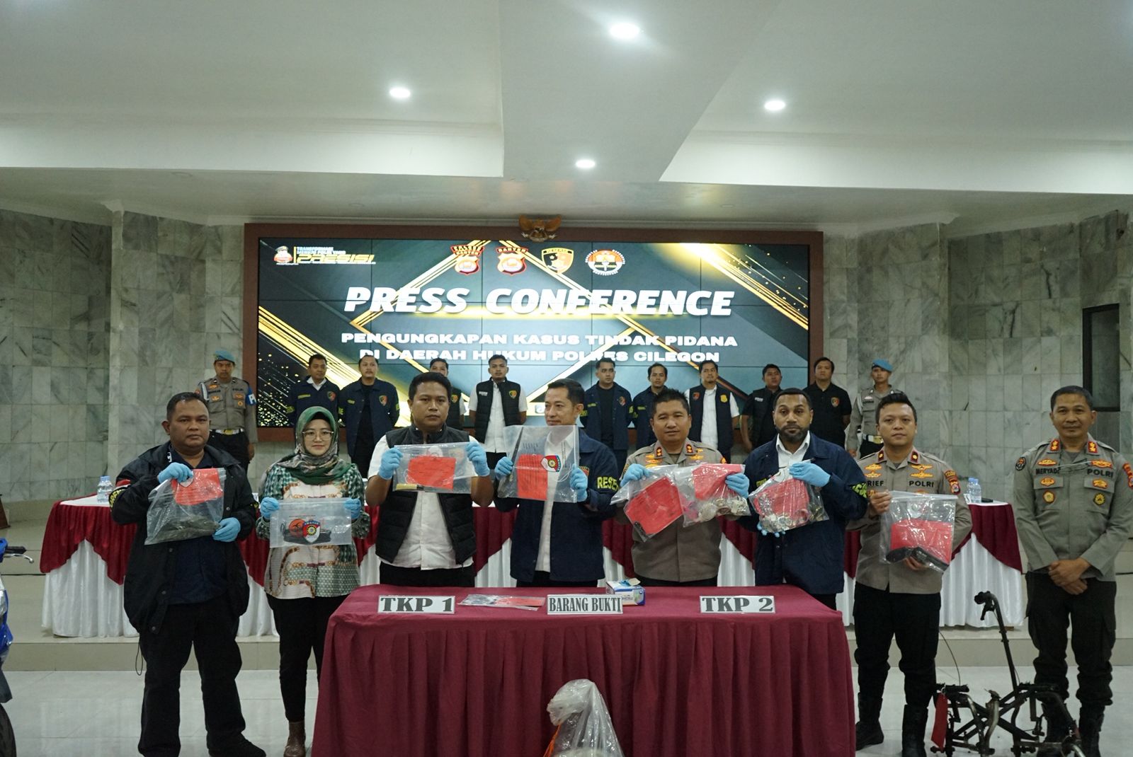Press conference tersebut disampaikan oleh Ditreskrimum Polda Banten Kombes Pol Dian Setyawan didampingi Kapolres Cilegon AKBP Dr. Martua Raja Taripar Laut Silitonga, Plh. Kabid Humas Polda Banten AKBP Meryadi, Wakapolres Cilegon Kompol Arief Nazarudin, Kasubdit Jatanran Ditreskrimum Polda Banten Kompol Yeremia Iwo, Kasat Reskrim Polres Cilegon AKP Yoga Tama, Ka Instalasi Forensik Modikolegal RSUD Cilegon Dr. Baeti Adhayati SP FM, Puslabfor Polri Kompol Irfan Rofik.