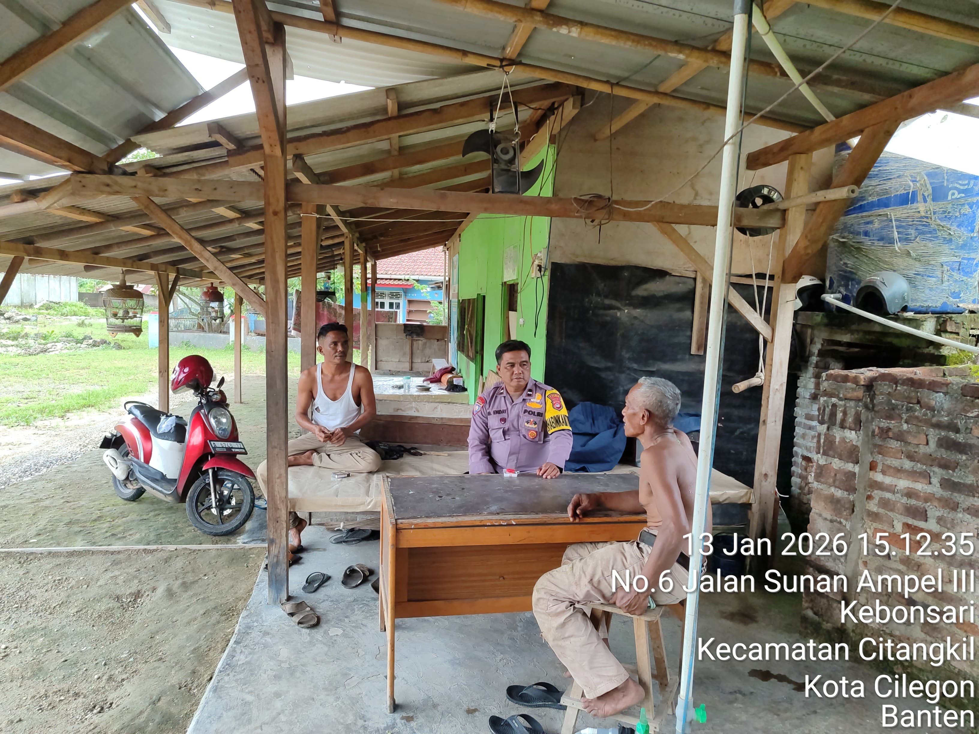 Cilegon - Personil Bhabinkamtibmas Polsek Ciwandan Polres Cilegon Polda Banten Menyampaikan Pesan Kamtibmas dan mengajak masyarakat terus aktif dalam kepedulian terhadap Pemeliharaan keamanan lingkungan di daerah Binaanya, Selasa (13/01/2026).