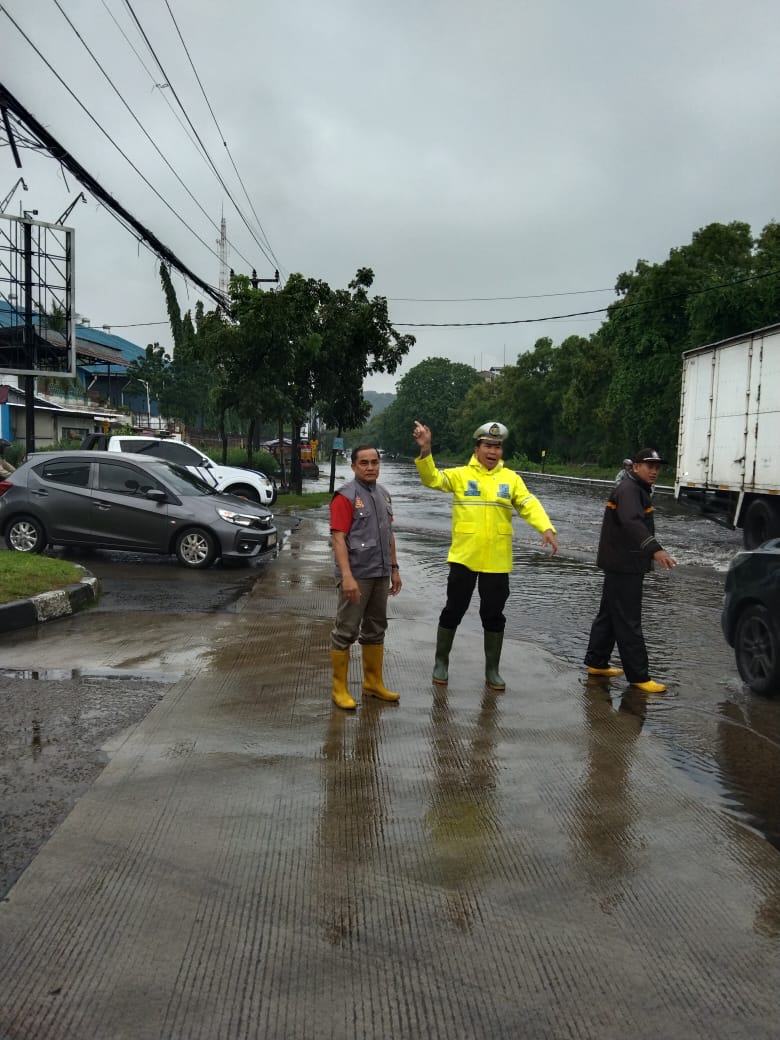 Personil Polsek Ciwandan Polres Cilegon Polda Banten Alihkan Arus Lalu-Lintas Dampak Dari Genangan Air