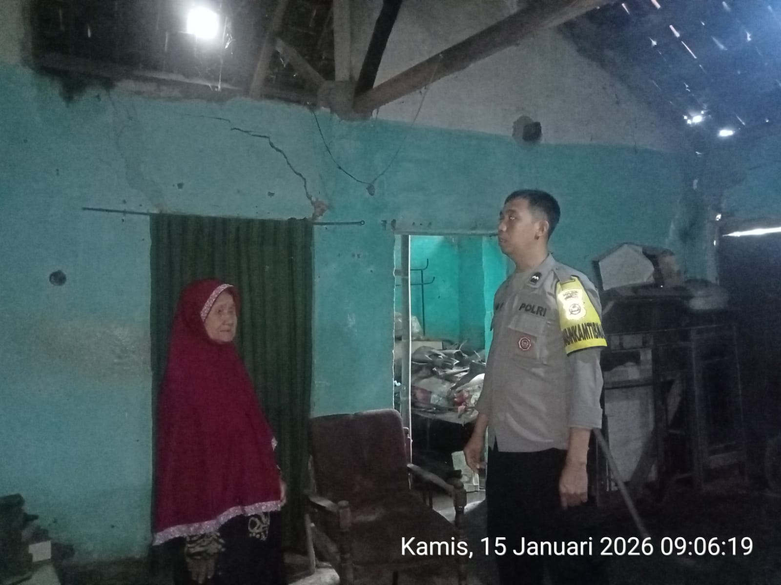 Cilegon - Bhabinkamtibmas Kelurahan Tamanbaru AIPDA Edianto, mengunjungi Ibu Marni yang rumahnya roboh bagian dapur akibat hujan angin di Lingkungan Sondol Rt. 03/02 Kelurahan Tamanbaru Kecamatan Citangkil, Kamis (15/01/2026).