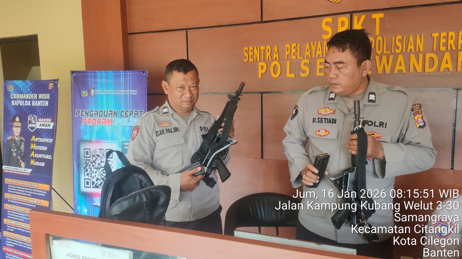 Kapolres Cilegon Polda Banten AKBP Dr. Martua Raja Taripar Laut Silitonga Melalui Kapolsek Ciwandan Polres Cilegon Polda Banten KOMPOL Andi Suherman Menekankan dan menegaskan dalam serah terima tugas jaga Mako dan pelayanan KA-SPKT wajib mengecek barang Inventaris mulai dari Senpi Dinas, Mobil Patroli, serta barang Inventaris lainya termasuk Mako apabila ada hal yang tidak sesuai wajib di cek secara seksama sehingga sewaktu serah terima tidak ada yang terabaikan dan dapat dipertanggung jawabkan, ungkapnya.
