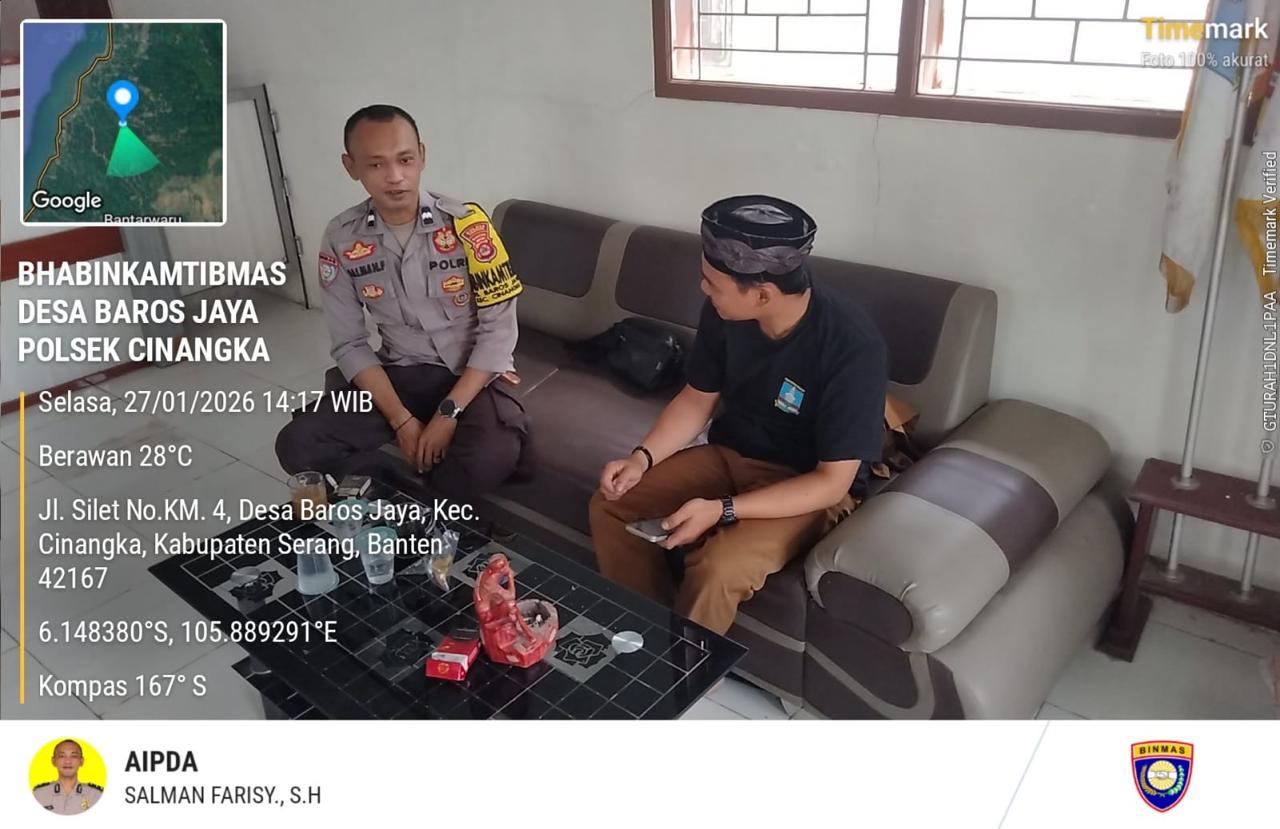*CILEGON* dalam Rangka Mengantisipasi Gktm di wilayah Personil Bhabinkamtibmas Cinangka melakukan patroli Dialogis dengan Kepala Desa dan warga dan Menanyakan situasi Kamtibmas di wilayah dalam Rangka Menjaga Harkamtibmas di Desa Binaannya Kecamatan Cinangka Kab. Serang. Selasa (26/01/2026).