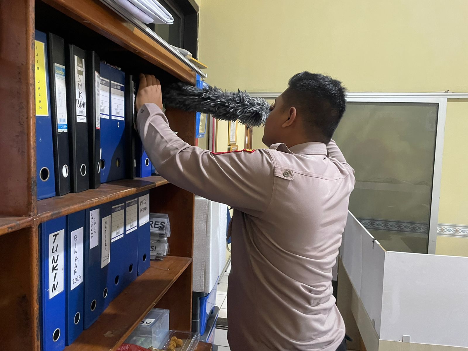 Anggota Bag SDM Polres Cilegon, Selaluu dalam melaksankan kegiatan membersihkan ruangan kerja secara rutin.