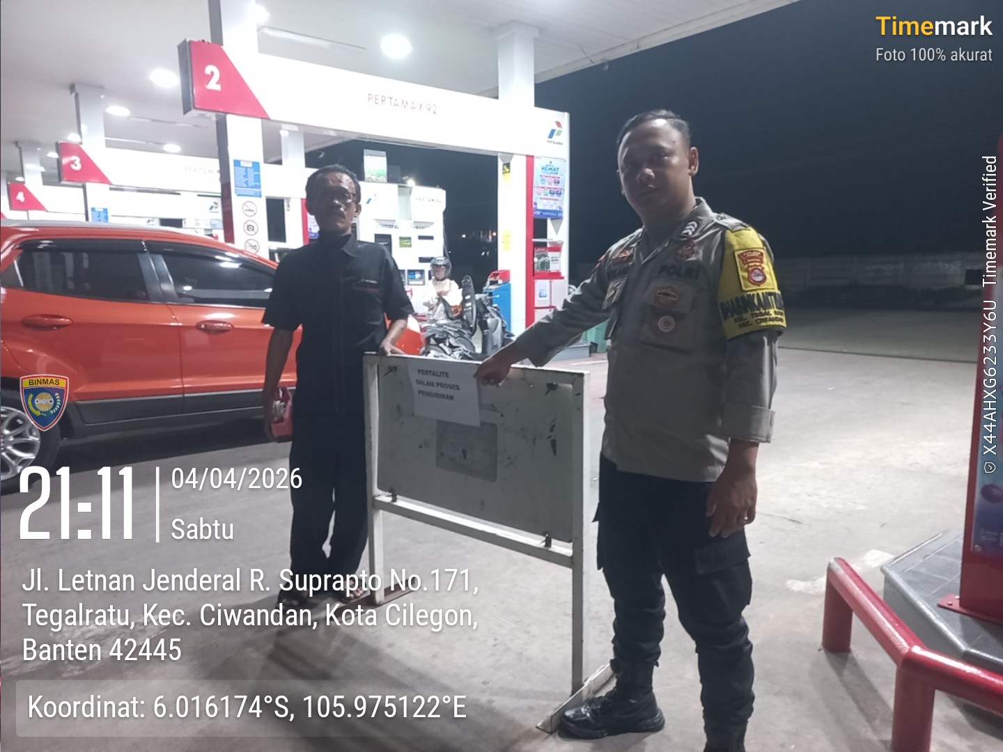 Cilegon - Kepolisian Polsek Ciwandan Polres Cilegon Polda Banten, melakukan pengecekan stok Bahan Bakar Minyak (BBM) di dua SPBU di wilayah Ciwandan, Cilegon, Sabtu (04/04/2026).