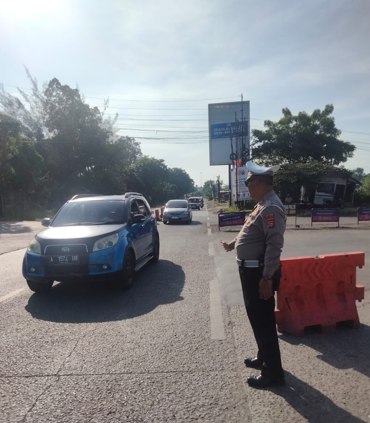 Cilegon - Personil Unit Lantas Polsek Ciwandan Polres Cilegon Polda Banten melaksanakan kegiatan monitoring jalur wisata di depan Pos Lantas JLS Ciwandan, Minggu (12/04/2026).