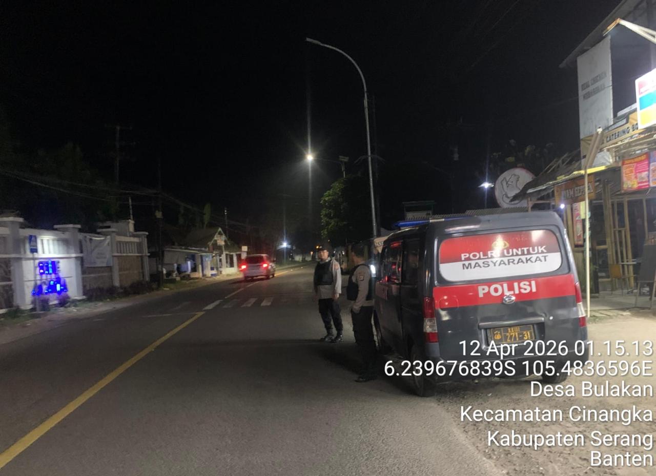 *Cilegon* – Dalam Rangka Pencegahan Kejahatan Jalanan dan Memelihara situasi keamanan dan menjaga serta memberikan rasa aman dan nyaman di masyarakat,Salah satu upaya untuk mewujudkan hal tersebut sebagaimana yang dilakukan oleh Personil Polsek Cinangka Polres Cilegon Polda Banten melaksanakan giat patroli blue light malam hari hingga menjelang pagi, Senin (13/04/2026).